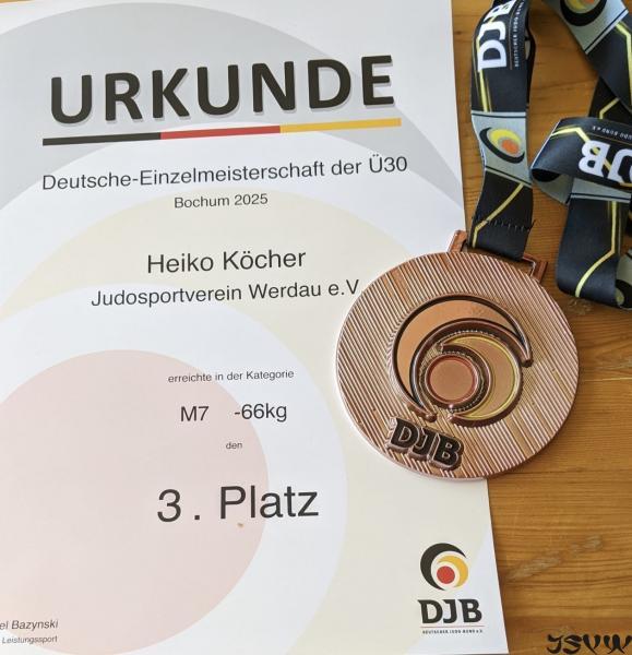Knapp 400 Sportler trafen sich zur Deutschen Meisterschaft der über 30 Jährigen in Bochum. In der Kategorie M7 absolvierte Heiko Köcher vier spannende Kämpfe. Mit zwei Siegen und zwei Niederlagen sicherte sich Heiko grandios Bronze.